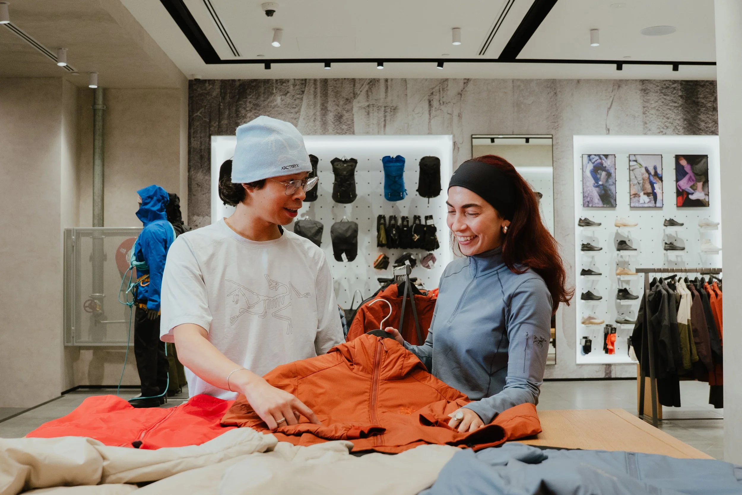 Two people are shopping for outdoor gear, examining clothing and gear on a table in a store.