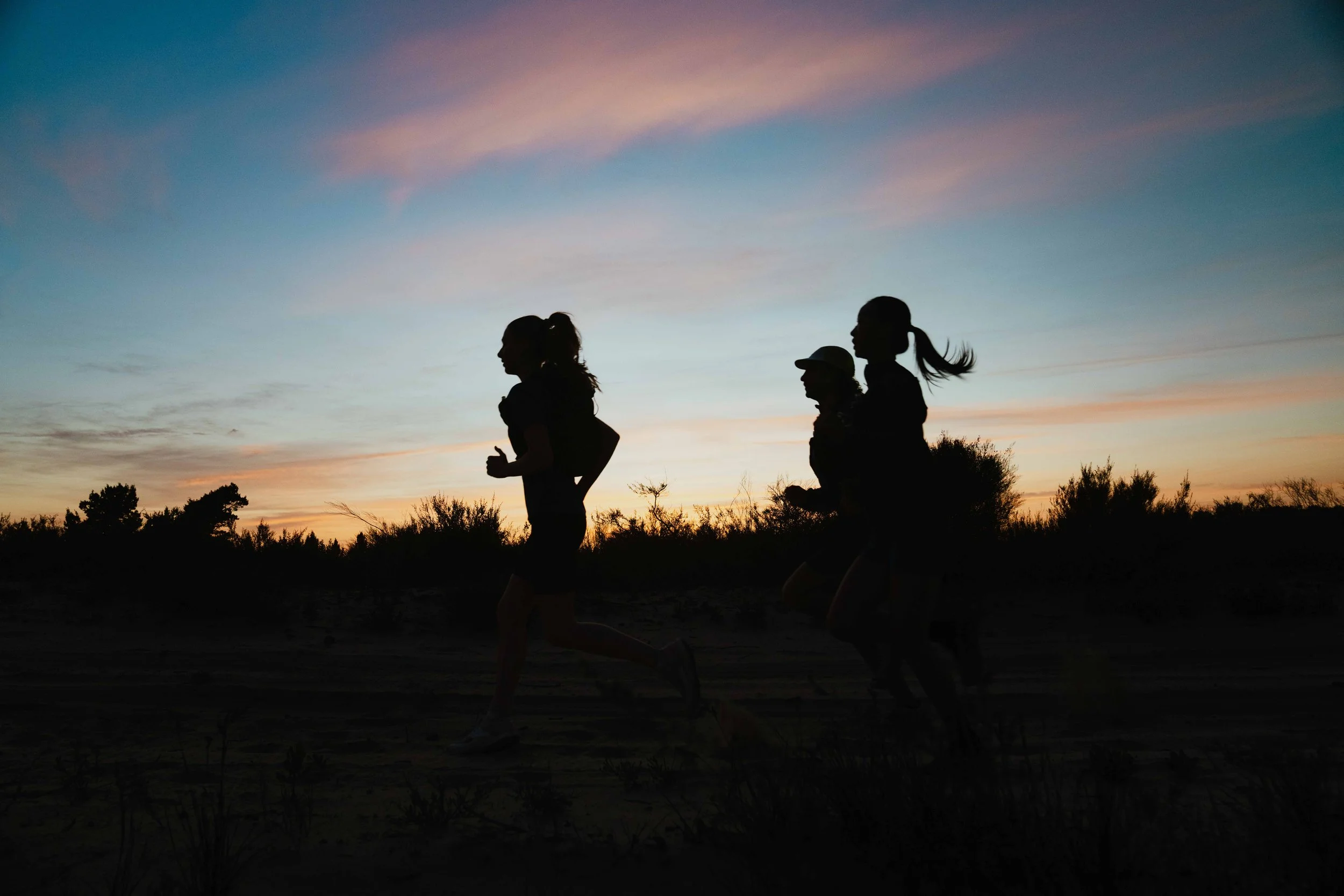 Silhouettes of four women running outdoors at sunset, with colorful sky and trees in the background.