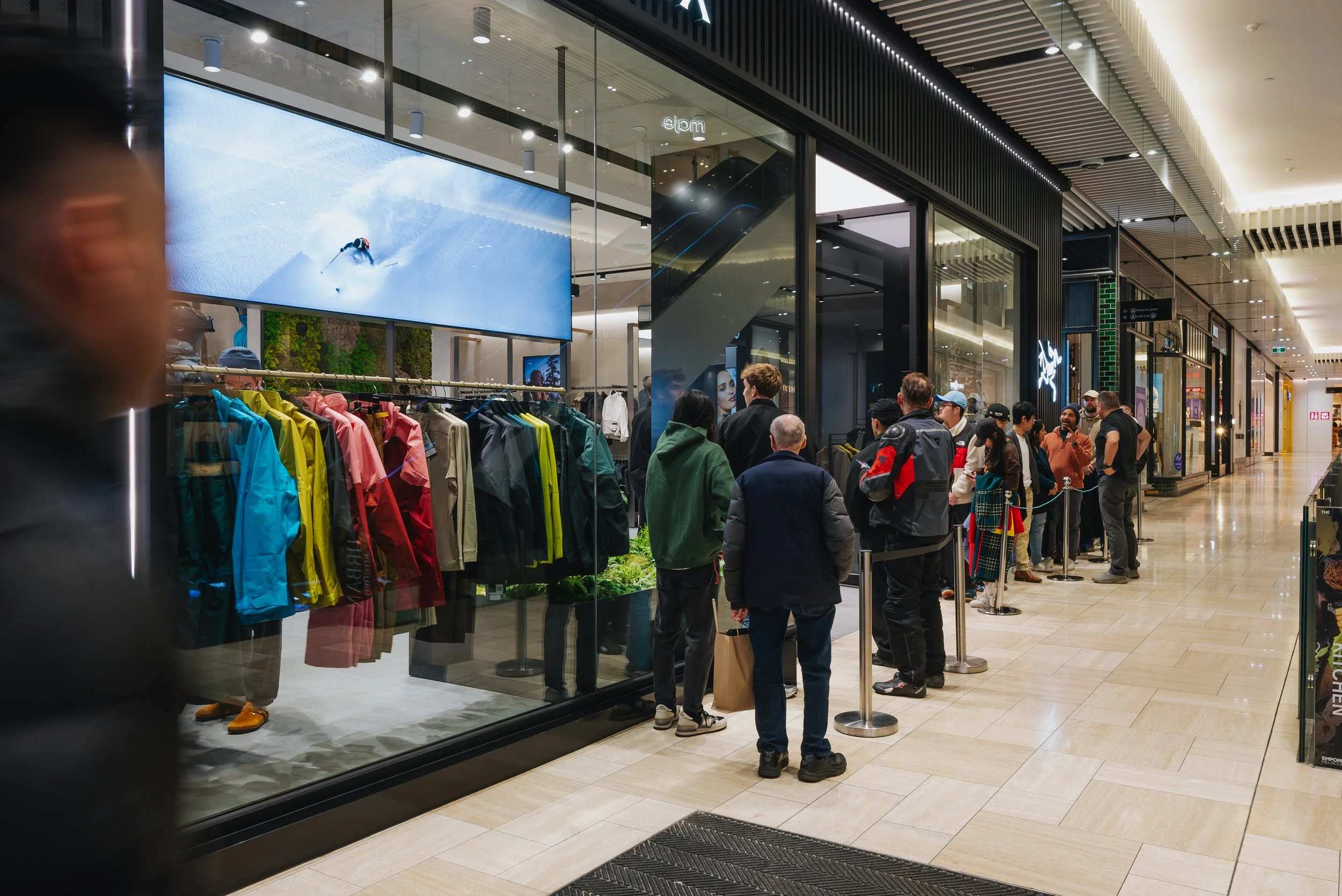 People lined up outside an Arc'teryx store in a shopping mall with a illuminated Arc'teryx logo on the black exterior wall.