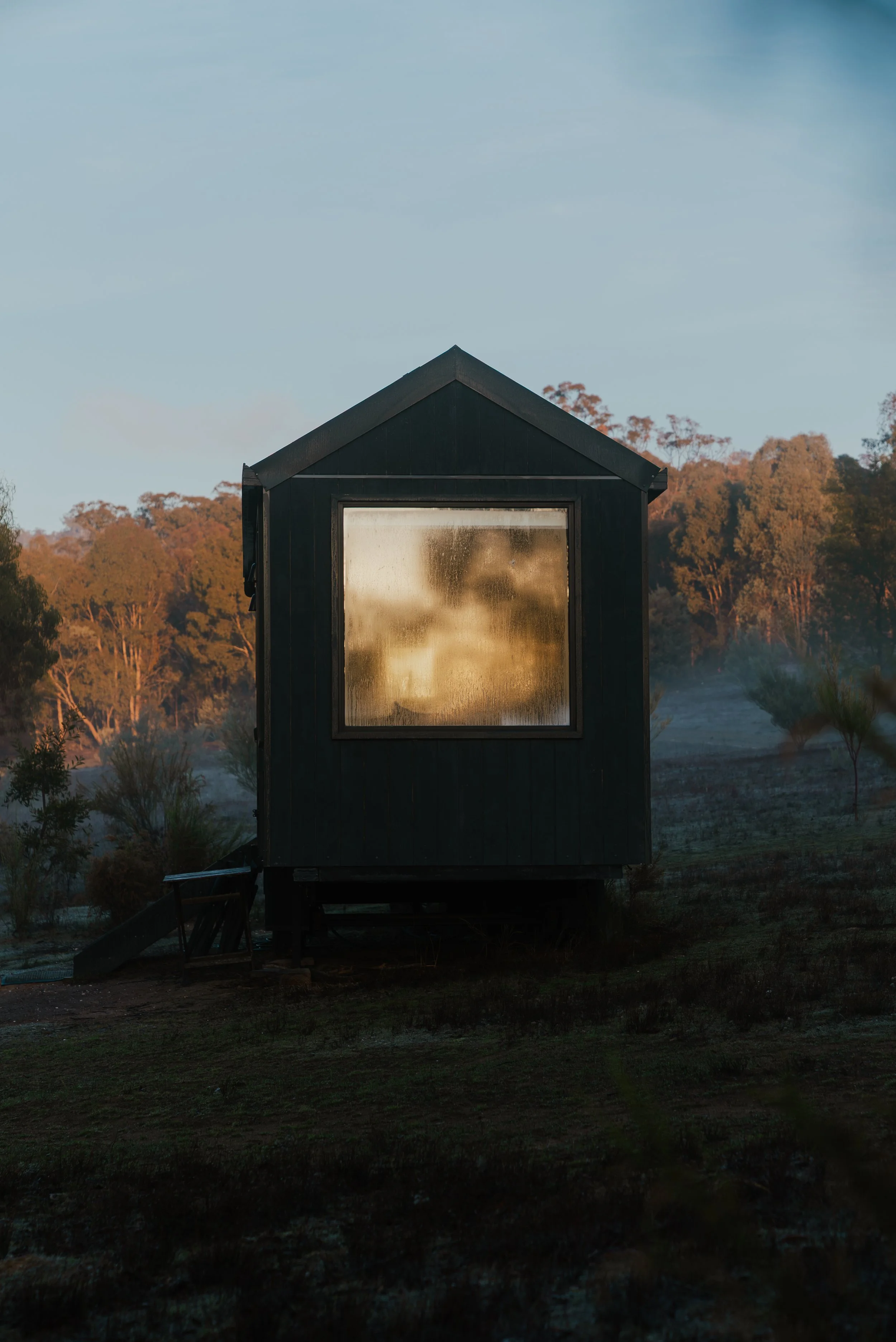 A small black house with large windows illuminated from inside, situated on a hillside with trees in the background at dusk.