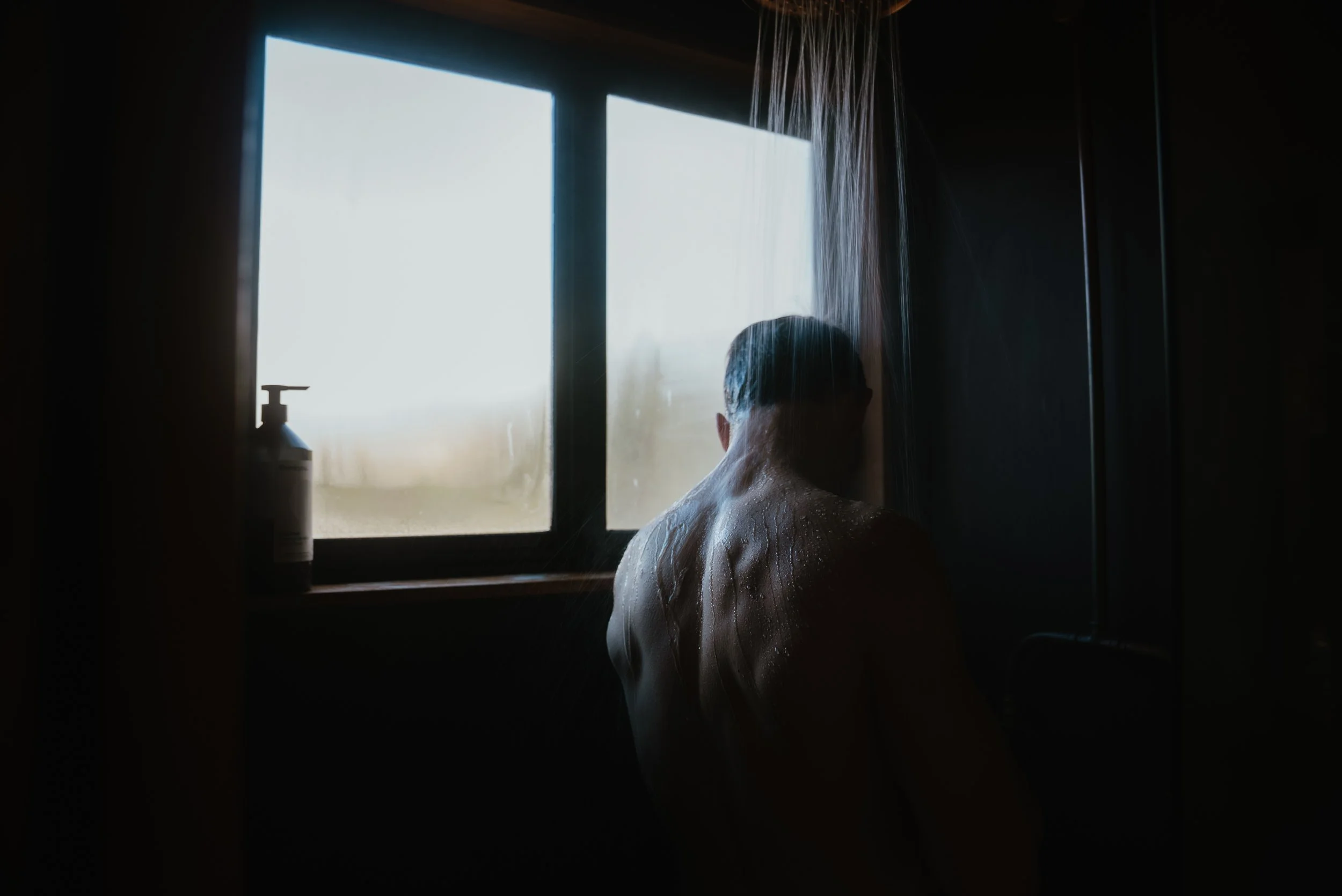 A person taking a shower in a dark bathroom near a window with water streaming down, a bottle of soap on the windowsill.